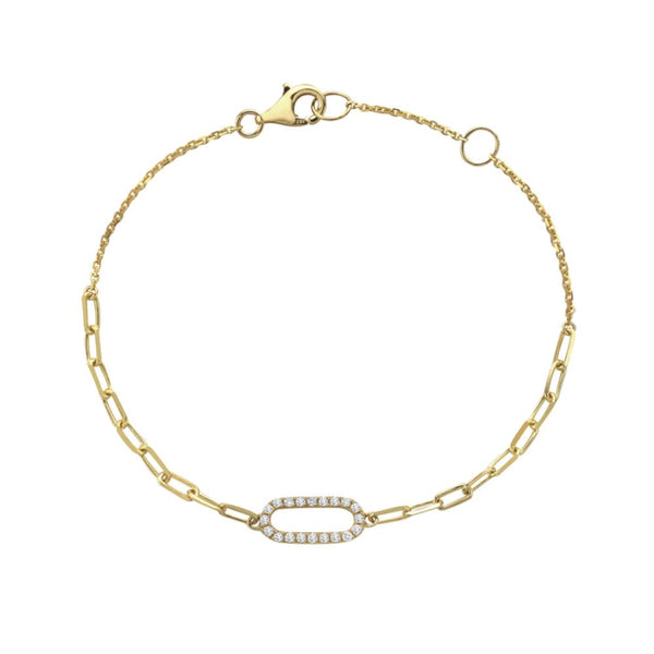 14k yellow gold paperclip chain bracelet featuring a diamond oval center.
