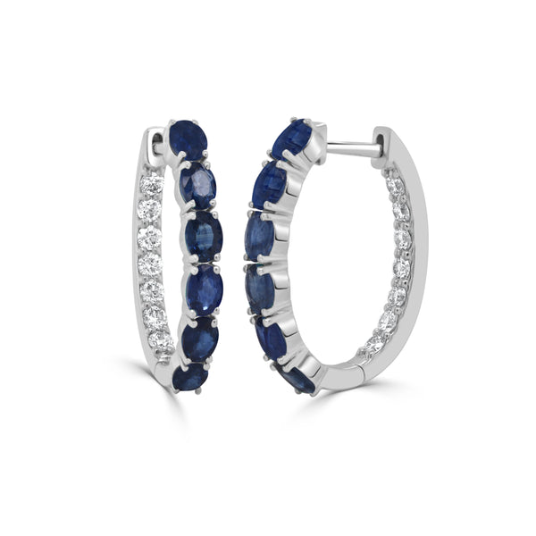 14K white gold oval sapphire and diamond inside hoop earrings.