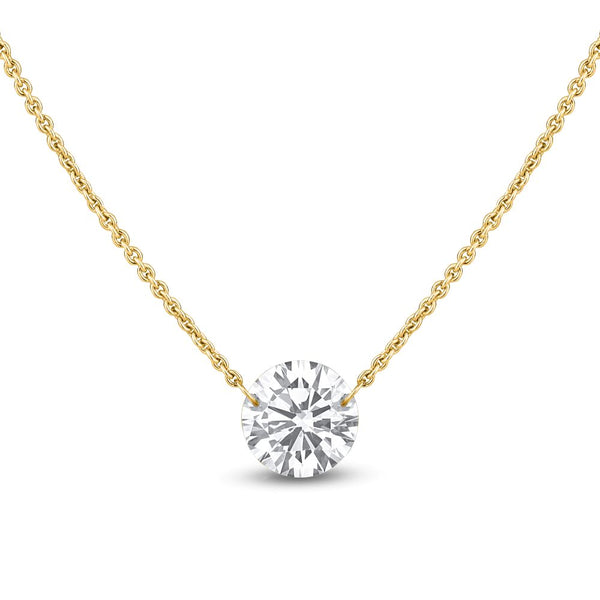 14k gold lab diamond solitaire necklace. The unique setting minimizes metal so the diamond appears to be floating.